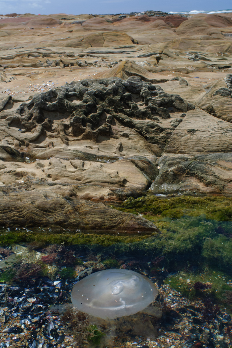 Las vacaciones son momentos especiales de reencuentro con las cosas más importantes de la vida. Con la familia, los amigos, con uno mismo y en mi caso, con el mar. En una de las tantas salidas encontré una aguaviva refugiada en las rocas de las canaletas. Entablamos un diálogo visual que me conmovió. Aquí comparto un resultado de esa charla.